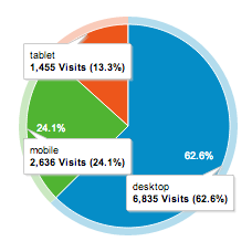 This pie chart on the right shows the percentages for visitors coming using mobile, tablet, and desktop devices for the past 12 months. You can view this pie chart for your own website by first selecting the past 12 months for your date range, and then on the left navigating to Audience > Mobile > Overview in Google Analytics. On the lower right you’ll see a small pie chart button. Push that, and you’ll see a chart like this one.