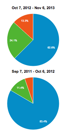 What this chart does not show us is the trend. This second set of pie charts shows us the direction in which things are headed. To get this chart I went to the date range in Google Analytics and checked the “Compare to:” box and selected “Previous period.” Now we are seeing a comparison between mobile vs. desktop visitors for the past 12 months and the 12 months preceding those. The bottom line–this website’s mobile visitors doubled in one year. That by itself should be a compelling enough reason to go responsive.